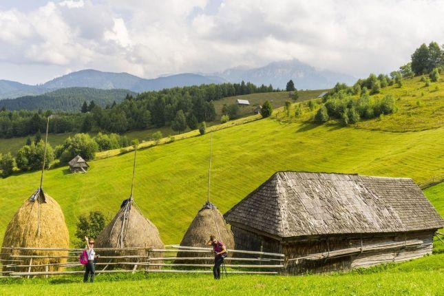 La prima vedere, această imagine pare desprinsă dintr-o carte poștală: dealuri verzi, fân strâns în clăi tradiționale și case vechi din lemn. Pentru mulți turiști, este o imagine de vis.