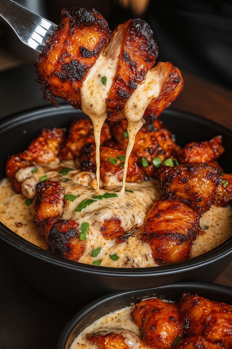 bucăți de pui la grătar sunt scăldate într-un sos cremos ușor de usturoi și sunt pe masă în mai puțin de douăzeci