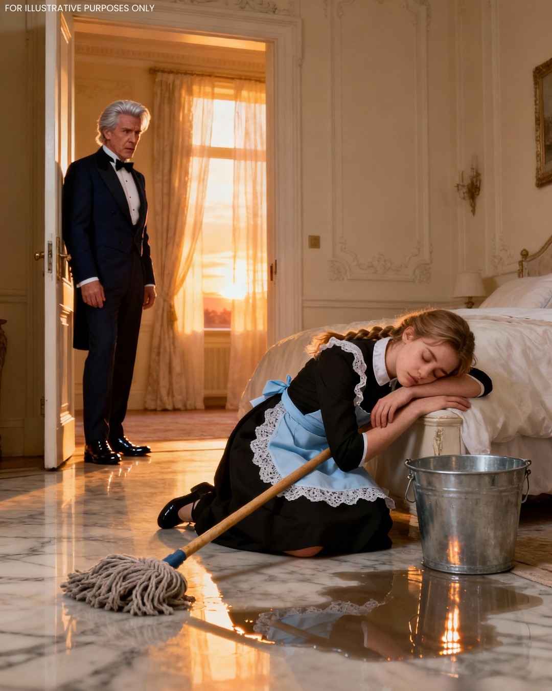 Soarele dimineții se filtra prin ferestrele înalte ale întinsei proprietăți Westbrook. Pe patul acoperit cu mătase al dormitorului matrimonial zăcea Emma, cu silueta ei mică ghemuită pe o pernă albă, cu o perie de curățat încă strânsă în mână. Uniforma ei era udă de transpirație, oboseala fiind evidentă. În apropiere, o găleată cu mop zăcea uitată.
