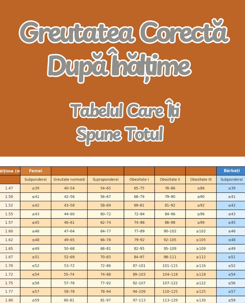 Probabil te-ai întrebat de multe ori „Câţi kg ar trebui să am dacă mărimea mea este…?” şi poate ai calculat indicele de masă corporală (IMC) sau ai urmărit câte calorii consumi. Dar adevărul este că nu putem să vorbim de un singur număr ideal pentru toată lumea – contează înălţimea, vârsta, dar şi construcţia corporală (schelet, mușchi, grăsime). De aceea, tabelele care îţi arată „greutatea normală” în funcţie de înălţime pot fi utile drept ghid, dar trebuie să le foloseşti cu atenţie.
