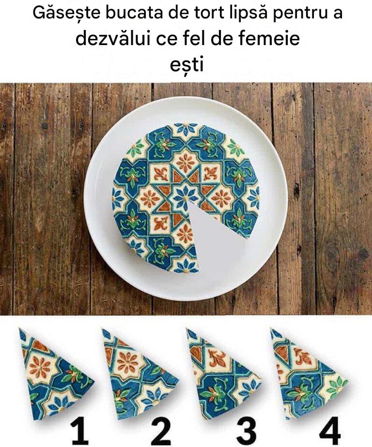 Imaginea prezintă un tort frumos decorat, căruia îi lipsește o felie. Sub tort, veți găsi patru posibile bucăți care ar putea umple acel spațiu gol. Doar una se potrivește perfect. Sarcina ta este simplă: uită-te la model, ai încredere în instinctele tale și alege bucata care ți se pare potrivită.
