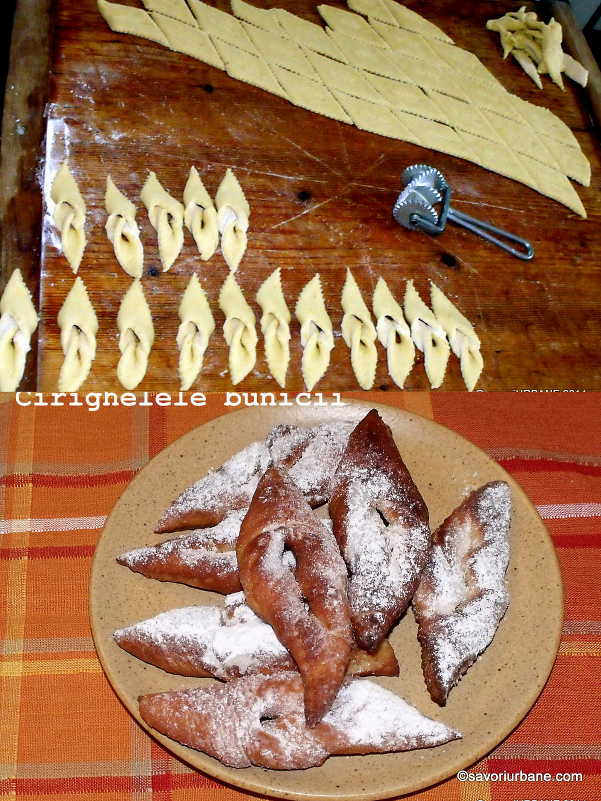 Pe blatul de lucru (sau planseta) infainat usor se intinde o foaie cu grosimea de cca. 3-4 mm si se taie romburi (cu latura de 5 cm) cu cutitul, cu taietorul de pizza/zimtat, sau cu o super-taietoare speciala (mostenire de familie :).