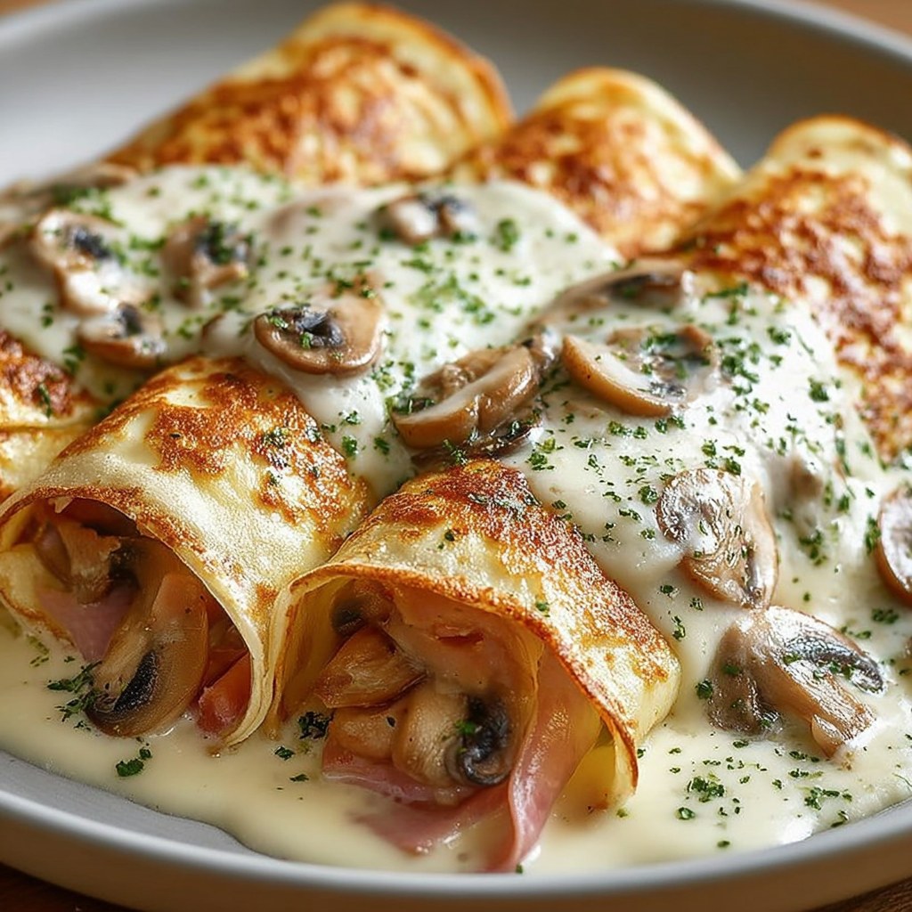 Clătite rulate cu șuncă fiartă, ciuperci și sos bechamel gratinat