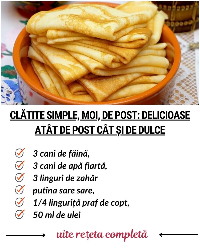 Această rețetă de clătite fără ouă și fără lapte este ideală pentru cei care țin post sau urmează o alimentație vegană. Sunt ușor de făcut, pufoase și gustoase, perfecte pentru a fi umplute cu gem, dulceață, fructe sau chiar compoziții sărate.