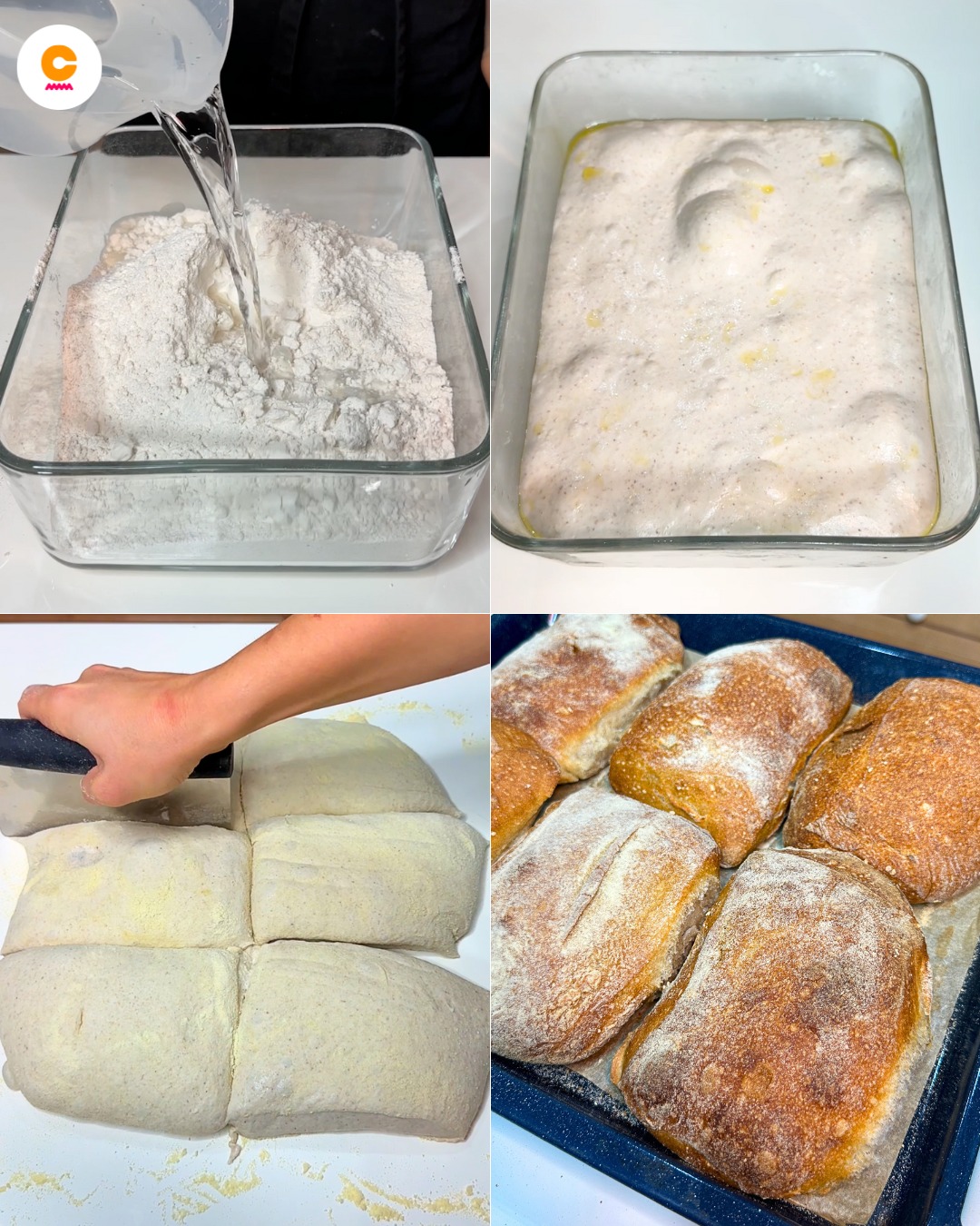 Inizia facendo l’autolisi, quindi aggiungi l’acqua alla farina 1 e impasta velocemente in modo grezzo, giusto il tempo di idratare completamente a farina. Lascia riposare per almeno 1 ora coperto con pellicola 2 o coperchio in un contenitore. Aggiungi il lievito madre rinfrescato e raddoppiato, a pezzetti nell’impasto 3 e continua ad impastare fino a quando diventerà omogeneo.