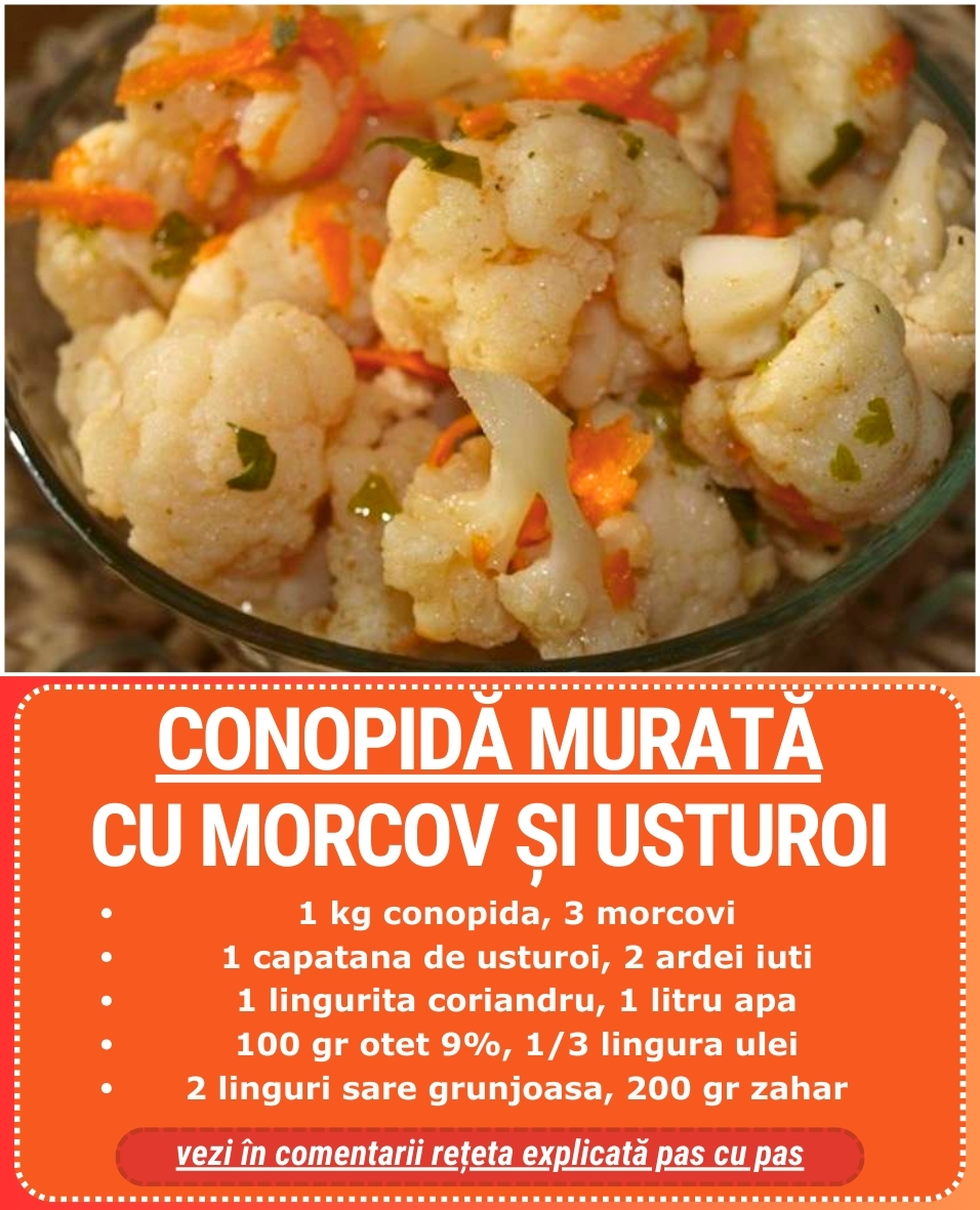 Conopida murata cu morcov si usturoi este foarte picanta, tocmai de aceea sotul meu o adora. Folosesc aceasta reteta de conopida murata de ani de zile. Niciodata nu dau gres. Incearc-o si tu!Conopidă proaspătăMorcovi bio