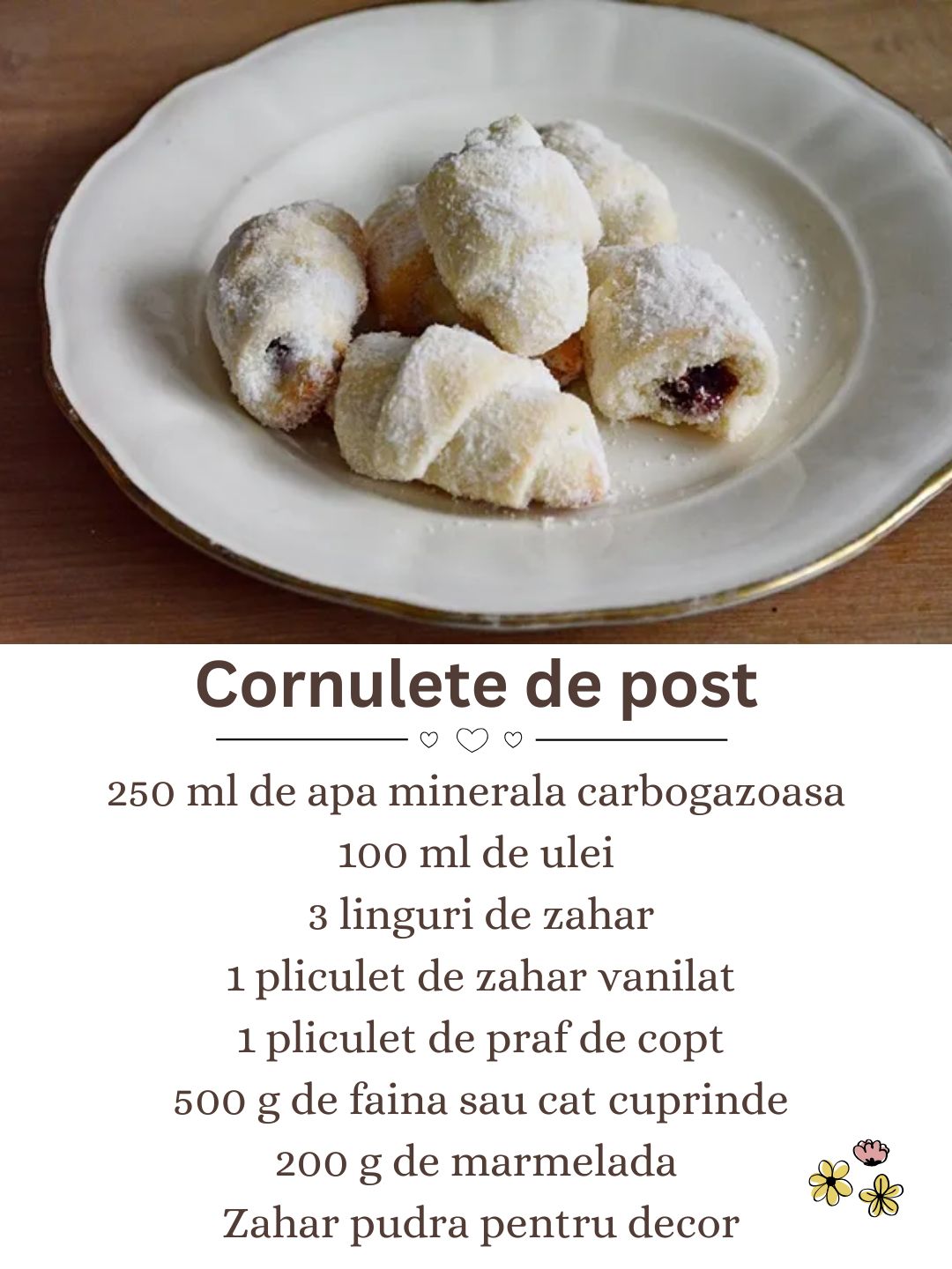 Cornuletele de post sunt o alegere excelenta pentru cei care isi doresc un desert savuros, dar fara ingrediente de origine animala. Acestea sunt fragede, aromate si se pregatesc rapid, fiind perfecte pentru post sau pentru momentele in care vrei ceva dulce, dar simplu de realizat.