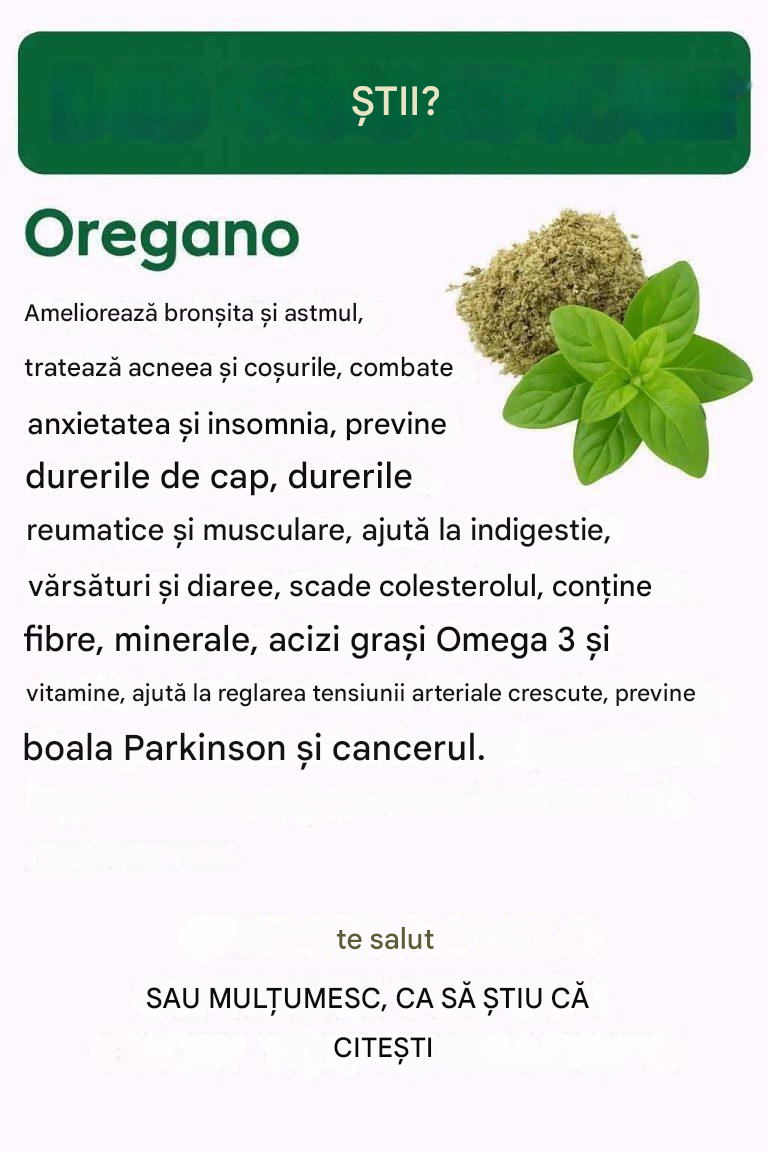 În vasta lume a plantelor medicinale, oregano nu este doar o vedetă a bucătăriei mediteraneene, ci și o adevărată comoară naturală pentru sănătate. Mulți oameni îl au acasă, fără să știe că poate deveni un puternic aliat terapeutic. Descoperă cât de mult poate face această plantă pentru tine! Oregano și sistemul respirator: Spune adio tusei și dificultăților de respirație. Oregano este cunoscut pentru proprietățile sale expectorante, antiinflamatorii și antibacteriene. Este ideal pentru ameliorarea simptomelor de bronșită, astm și răceală, ajutând la desfundarea căilor respiratorii, eliminarea flegmei și ușurarea respirației. Ceaiul cald de oregano poate fi exact ceea ce ai nevoie în zilele reci sau în timpul atacurilor de alergie.