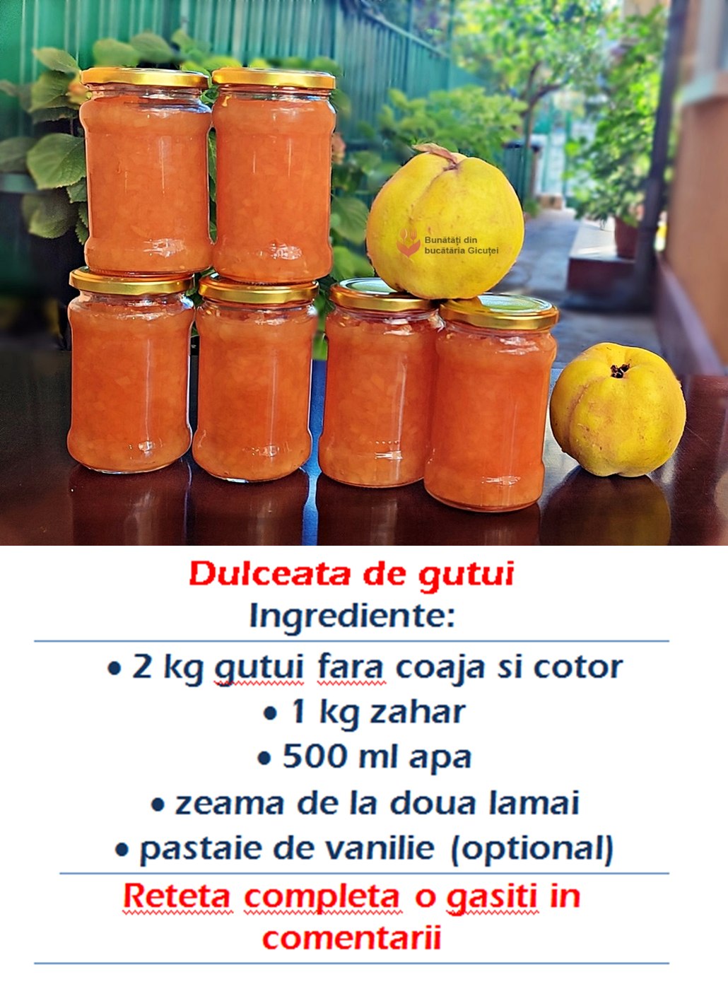 Daca probati reteta mea de Dulceata de gutui sau orice alta reteta de pe blog, va astept cu drag sa reveniti si sa imi spuneti cat de mult v-au placut. Toate sfaturile/sugestiile primite de la voi sunt binevenite, omul cat traieste invata.