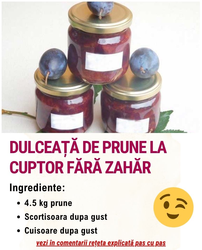 Dulceata de prune fara zahar se prepara printr-o procedura foarte simpla. Curatam prunele, le taiem in doua si le punem intr-un vas de copt. Gemul se coace aproape singur in cuptor.
