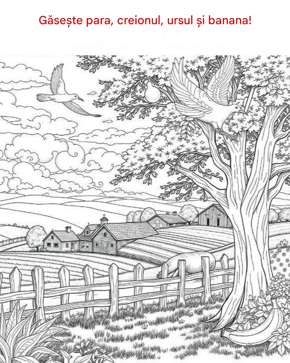 Dar ascunsă sub acel cadru calm se află o provocare - poți observa o pară, un creion, un urs și o banană, integrate ingenios în peisaj?