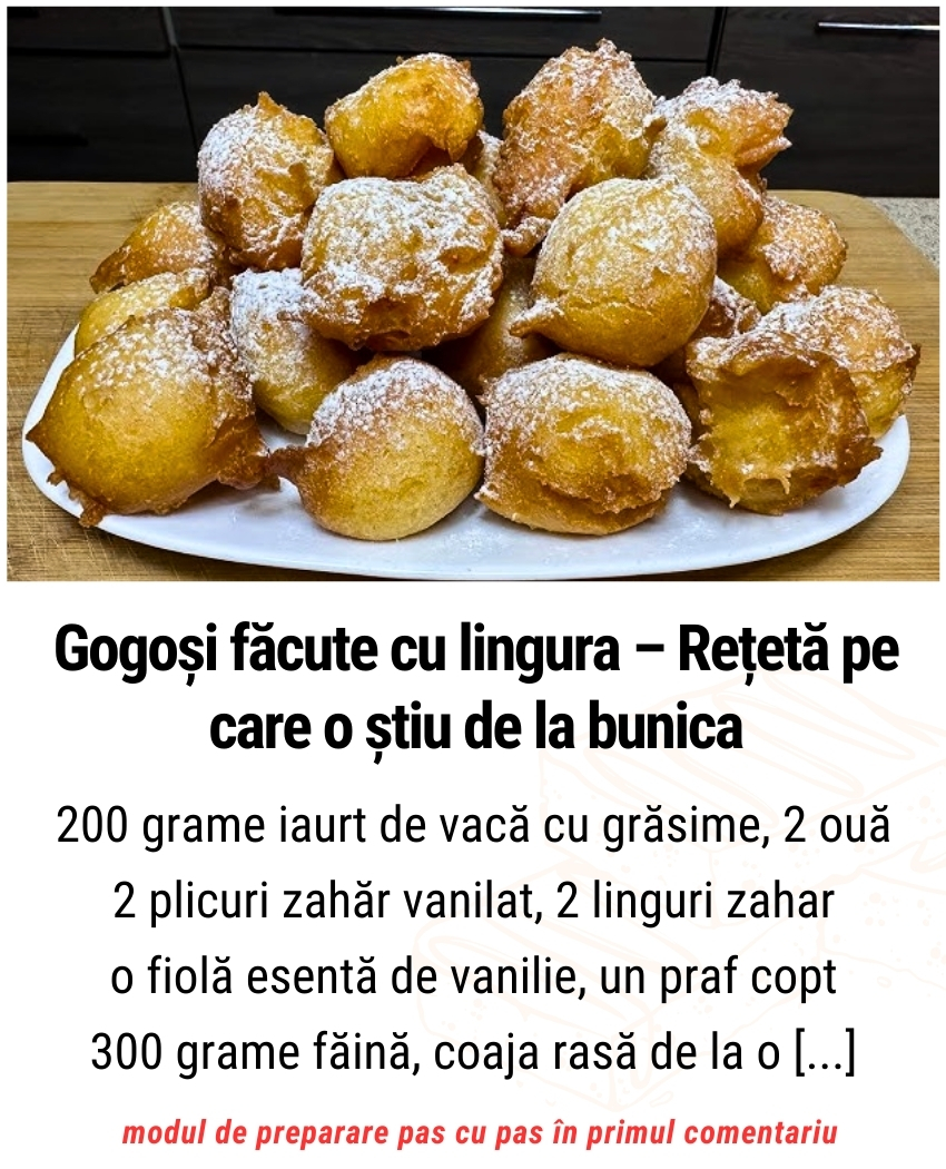 Pufoase, aurii și incredibil de aromate, aceste gogoși făcute cu lingura sunt o adevărată comoară culinară transmisă din generație în generație. Rețeta este una simplă, dar plină de suflet, și aduce cu ea acel gust autentic al copilăriei petrecute în bucătăria bunicii. Datorită iaurtului și cojii de lămâie, gogoșile capătă o textură ușoară și un parfum discret, dar inconfundabil. Nu ai nevoie de forme sau ustensile sofisticate – doar o lingură, puțin timp și poftă de ceva dulce!