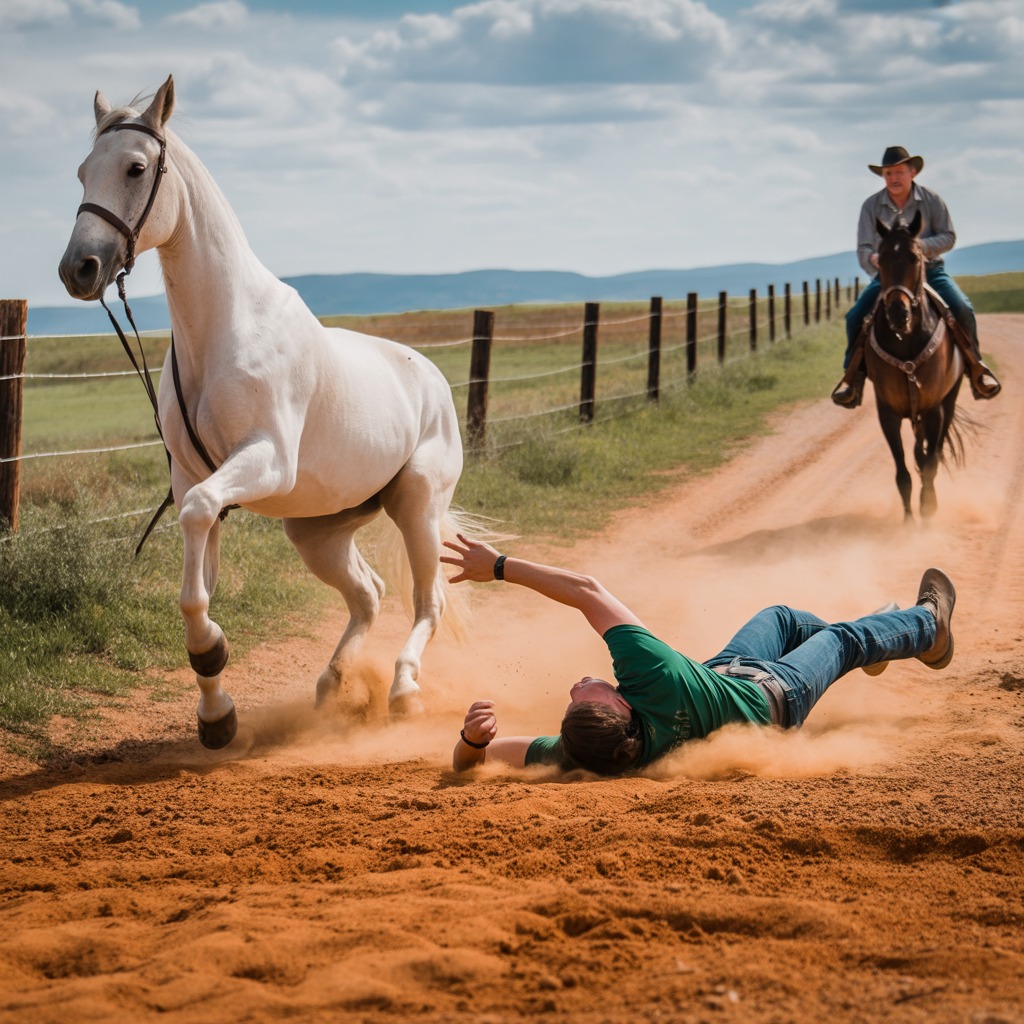 Cu o privire pierdută și sânge pe gât acolo unde frâul îi tăiase pielea.