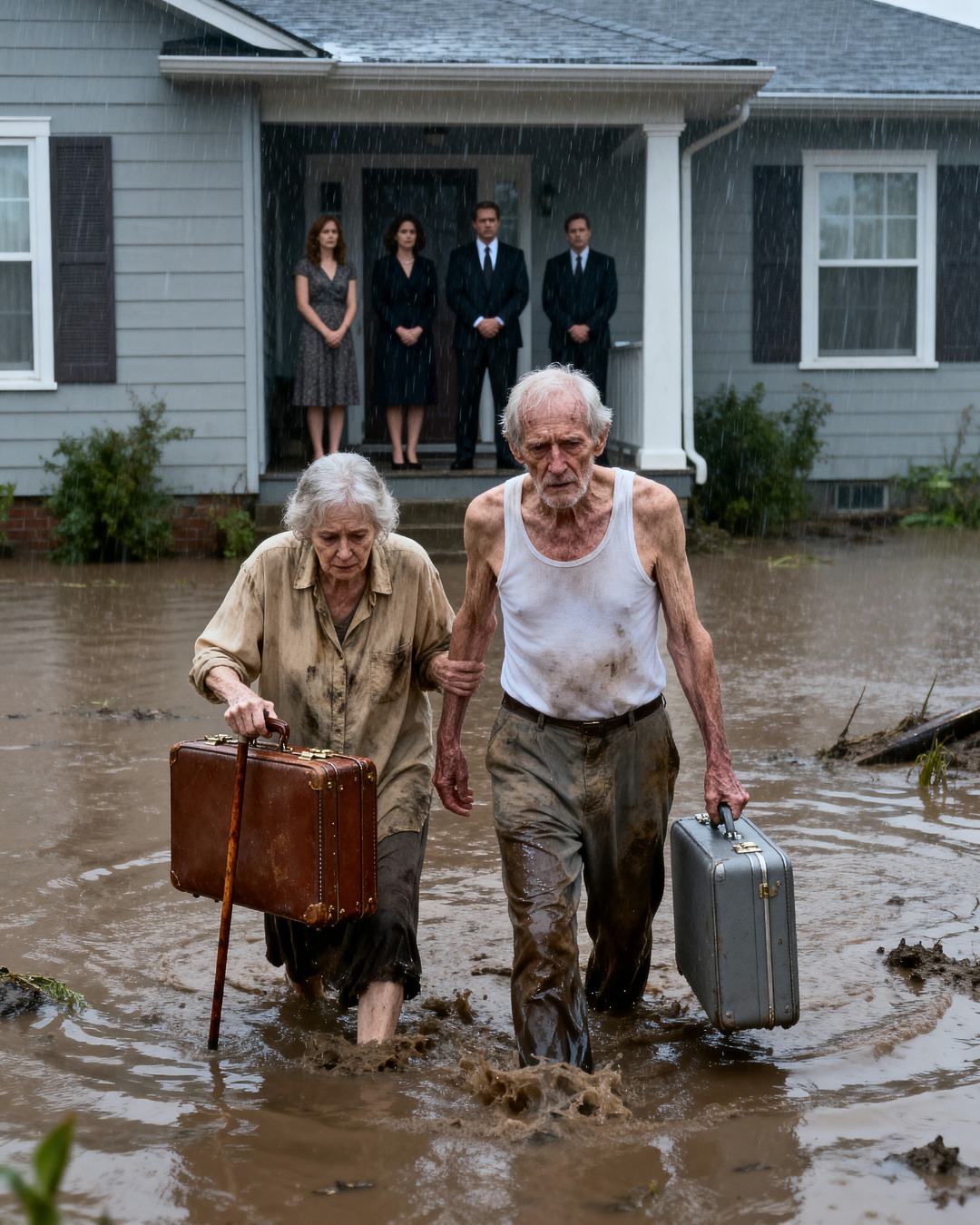 Până când eu și soția mea ajungem la bordură, cerul de deasupra Parcului Monterey se deschisese complet. Ploaia rece se revarsă în pânze groase, transformând felinarele în dâre tremurânde de aur. Elena strânge strâns o umbrelă spartă care abia funcționează. Trag în spatele meu două valize uzate, roțile lor frecând trotuarul crăpat.
