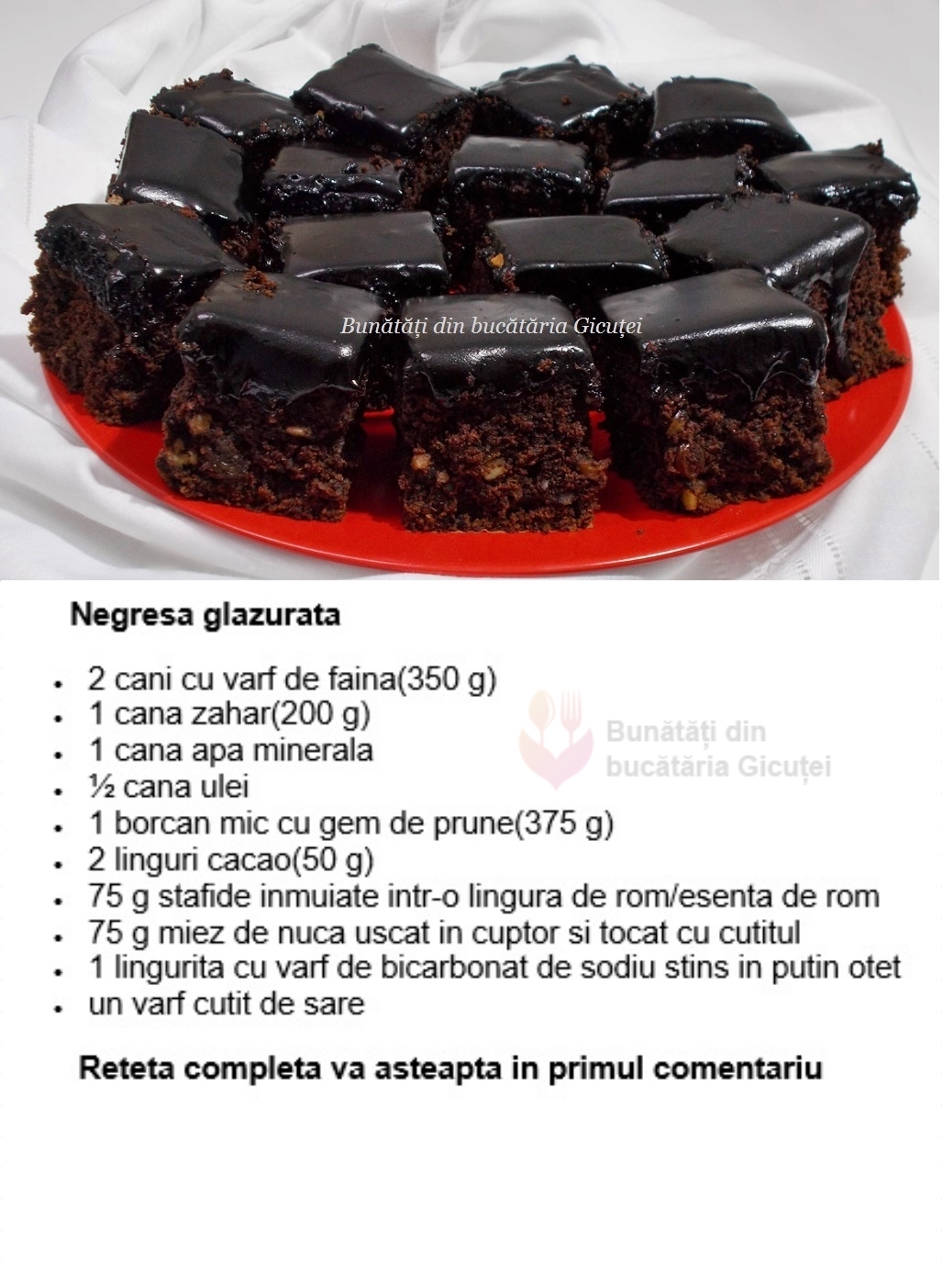Daca probati reteta mea de Negresa glazurata de post sau orice alta reteta de pe blog, va astept cu drag sa reveniti si sa imi spuneti cat de mult v-au placut. Toate sfaturile/sugestiile primite de la voi sunt binevenite, omul cat traieste invata.