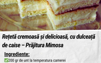 Rețetă cremoasă și delicioasă, cu dulceață de caise – Prăjitura Mimosa. Daca vreti o prajitura cu care sa va…