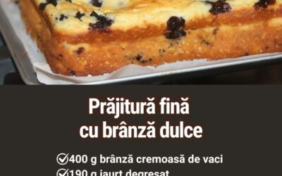 Prăjitură fină cu brânză dulce Rețeta Ingrediente necesare:400 g brânză cremoasă de vaci190 g iaurt degresat5 linguri zahăr3 linguri griș3 linguri făină1…