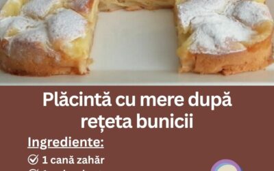 Ingredientele Ingrediente (blat):2 mere2 ouă1 cană zahăr1 pahar lapte1 plic zahăr vanilat1 linguriță praf de copt1 cană făinăIngrediente (cremă):1 ouZahăr după…