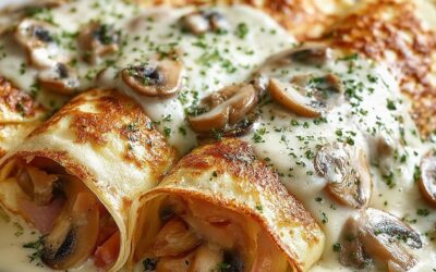Clătite rulate cu șuncă fiartă, ciuperci și sos bechamel gratinat