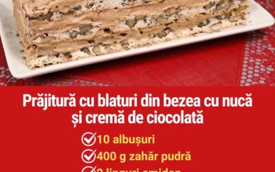 Prăjitură fină și delicioasă, fără făină Ingrediente necesare pentru blaturi:10 albușuri240 g zahăr pudră2 linguri amidon de porumb400 g bucățele nuci,…