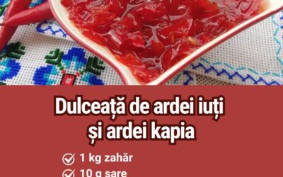 Dulceață de ardei iuți și kapia Rețeta Ingrediente pentru 6 borcane (180 ml): 1 kg zahăr 10 g sare 100 ml zeamă de lămâie 550 g…