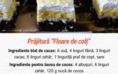 Prăjitura „Floare de colț” îmbină perfect texturile și aromele într-un desert de vis. Blatul fraged de cacao, acoperit cu o bezea crocantă…