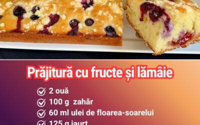 Prăjitură cu lămâie și fructe Desert rapid și delicios de vară Ingrediente 2 ouă 100 g zahăr extract de vanilie 60 ml ulei de floarea-soarelui 125 g…