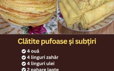 Clătite fine și aerate, de casă Ingrediente necesare: 4 ouă 4 linguri zahăr 4 linguri ulei 1 plic zahăr vanilat…
