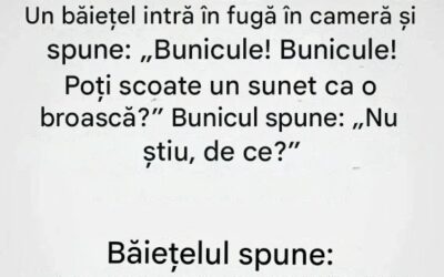 Un băiețel intră în fugă în cameră și spune: „Bunicule! Bunicule! Poți scoate un sunet ca o broască?” Bunicul spune:…