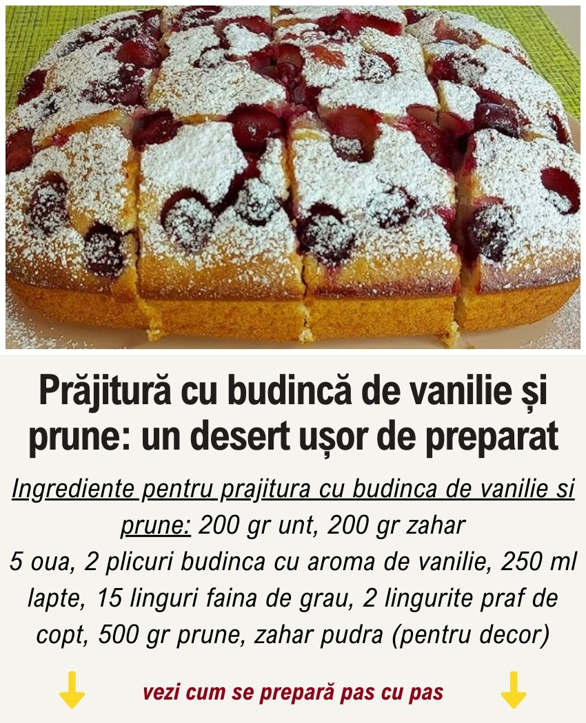 Astazi iti recomand o prajitura cu budinca de vanilie si prune. Acest desert pufos are un gust minunat si se prepara foarte rapid. Gasesti reteta explicata pas cu pas in randurile de mai jos.