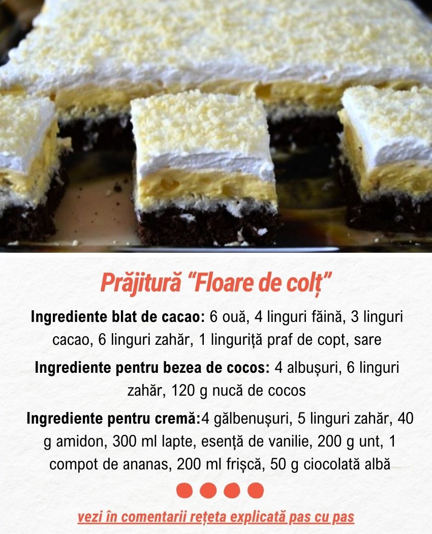 Prăjitura „Floare de colț” îmbină perfect texturile și aromele într-un desert de vis. Blatul fraged de cacao, acoperit cu o bezea crocantă și parfumată cu nucă de cocos, creează o bază perfectă pentru crema catifelată de vanilie și bucățelele suculente de ananas. Este o prăjitură elegantă și spectaculoasă, ideală pentru mesele festive sau pentru a adăuga un strop de rafinament în momentele speciale.