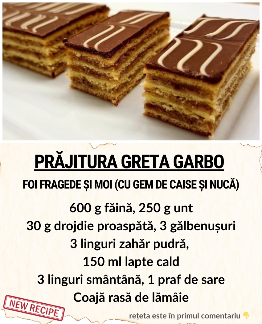 Prăjitura Jerbo (Greta Garbo) este un desert clasic, cu un gust inconfundabil, care îmbină armonios aromele de nucă, gem de caise și ciocolată. Foi fragede și moi, umplute cu straturi generoase de umplutură dulce-acrișoară și acoperite cu un strat elegant de ciocolată, fac din această prăjitură un adevărat răsfăț. Este o alegere perfectă pentru mesele de sărbătoare sau pentru a-ți impresiona invitații cu un desert tradițional și sofisticat. Aceasta este rețeta ideală pentru cei care apreciază combinațiile de texturi și arome bine echilibrate!