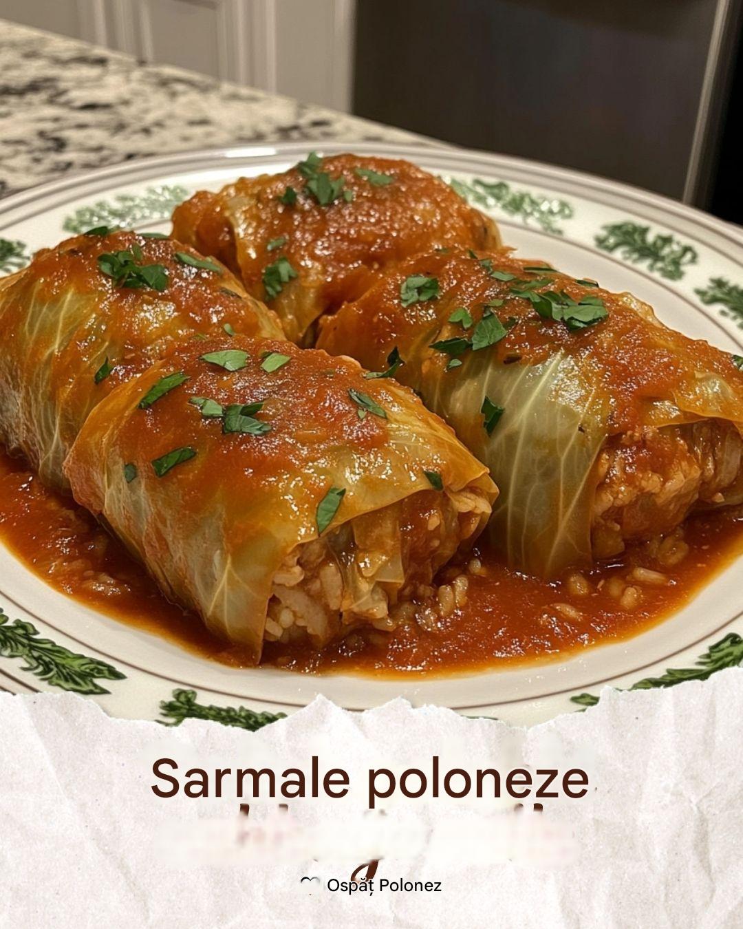 Gołąbki poloneze (sarmale) servite pe o farfurie cu sos de roșii.
