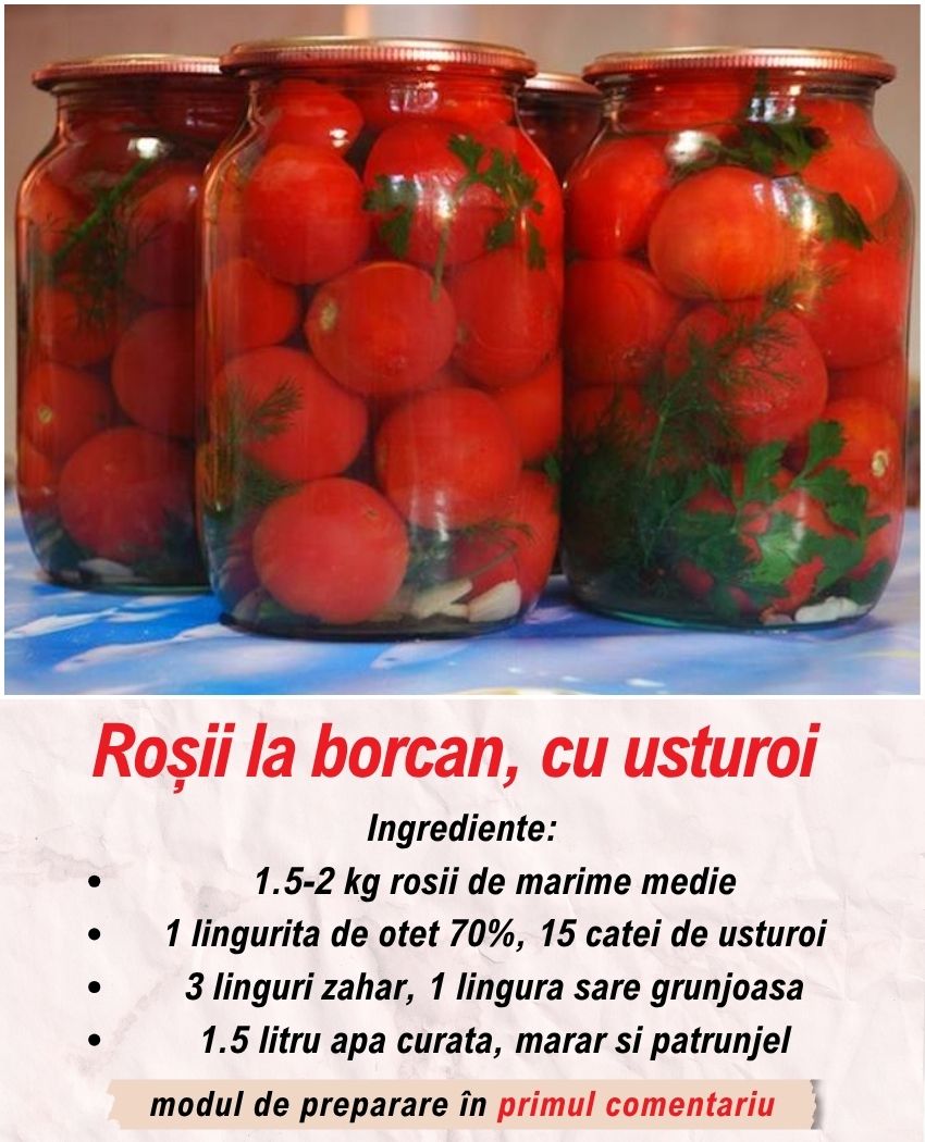 Pe fundul fiecarui borcan de 3 litri punem cate 15 catei de usturoi decojiti, apoi asezam cu grija rosiile. Acestea ar trebui sa fie asezate unele langa altele, pentru ca golurile dintre ele sa fiec at mai mici. Umplem borcanele pana sus. Printre rosii, ar trebui sa punem si cateva fire de marar si patrunjel.