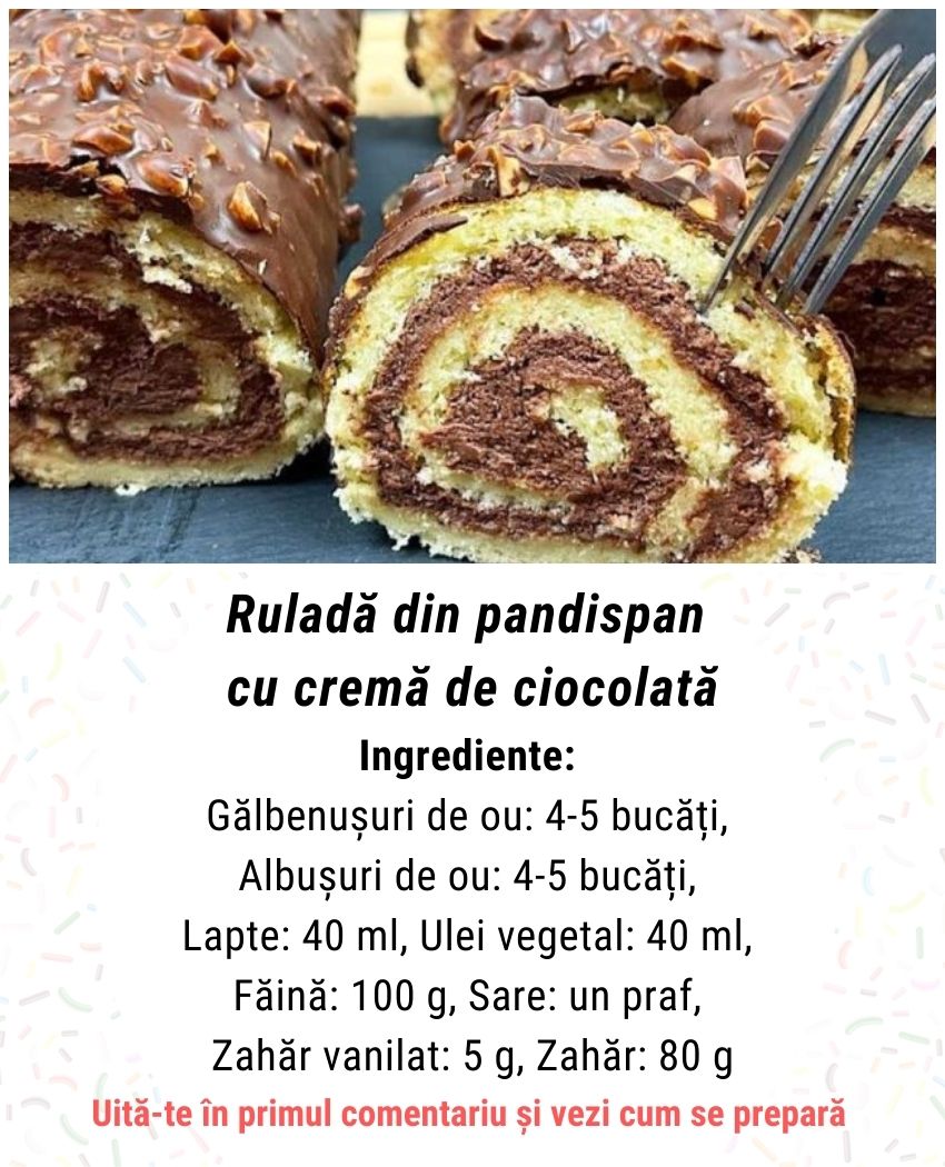 Rulada din pandispan cu cremă de ciocolată este un desert delicios, care combină un blat pufos de pandispan cu o umplutură cremoasă și o glazură delicioasă de ciocolată.