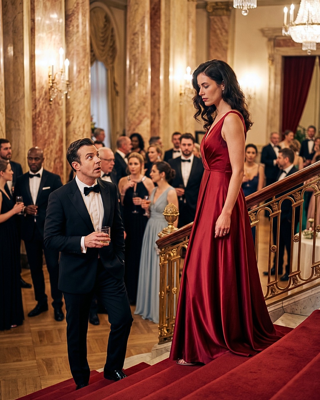 Candelabre de cristal aruncau o lumină aurie caldă peste podelele de marmură, iar aerul purta un amestec blând de parfum scump și șampanie. Râsete, clinchete de pahare și negocieri discrete umpleau fiecare colț al camerei.
