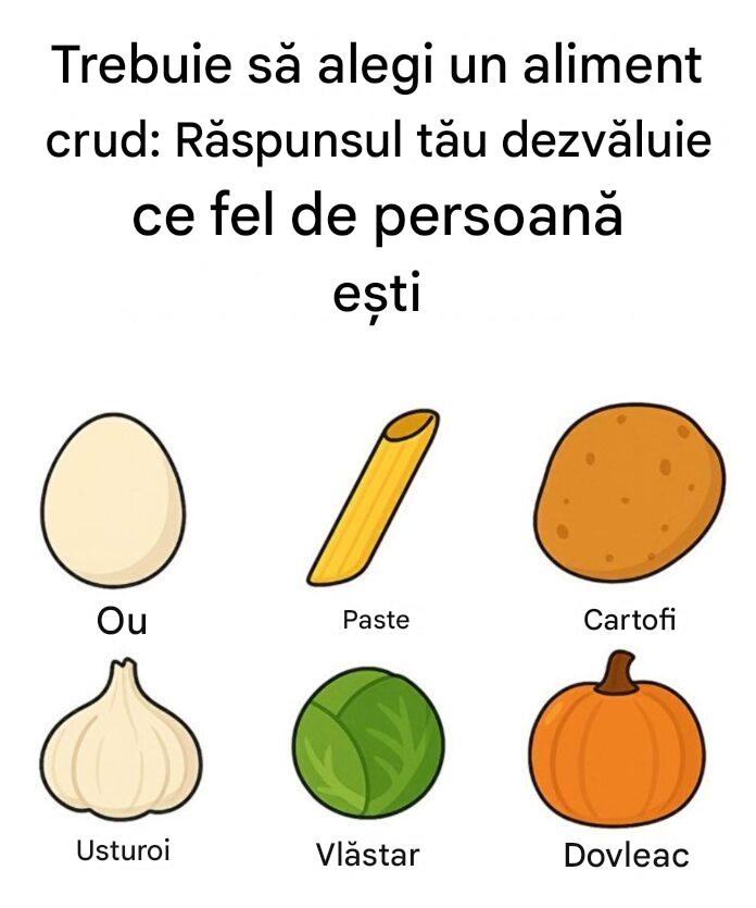 Uneori, o simplă sugestie poate declanșa sau reflecție surprinzător de precisă. Gândește-te la asta ca la un test de personalitate vesel - un chestionar de personalitate distractiv pe care îl poți împărtăși cu prietenii și familia la masă sau la telefon. Iată jocul: dacă ar trebui să alegi un aliment crud - ou, paste, cartofi, usturoi, vlăstă sau dovleac - pe care l-ai alege primul? Alegerea ta în acest exercițiu jucăuș de „personalitate bazată pe alimente crude” poate sugera punctele tale forte, stilul tău și modul în care faci față micilor provocări ale vieții.