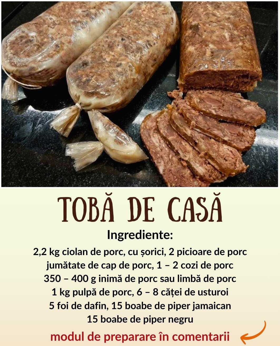 Această rețetă de tobă de casă este un adevărat festin culinar pentru iubitorii preparatelor tradiționale, cu gust natural de carne fiartă, bine condimentată, așa cum se pregătea odinioară în familie. Folosind ciolan, picioare, cap de porc și un plus de inimă sau limbă, rezultatul este o compoziție bogată în textură, cu un echilibru între bucăți fragede și gelatină naturală.
