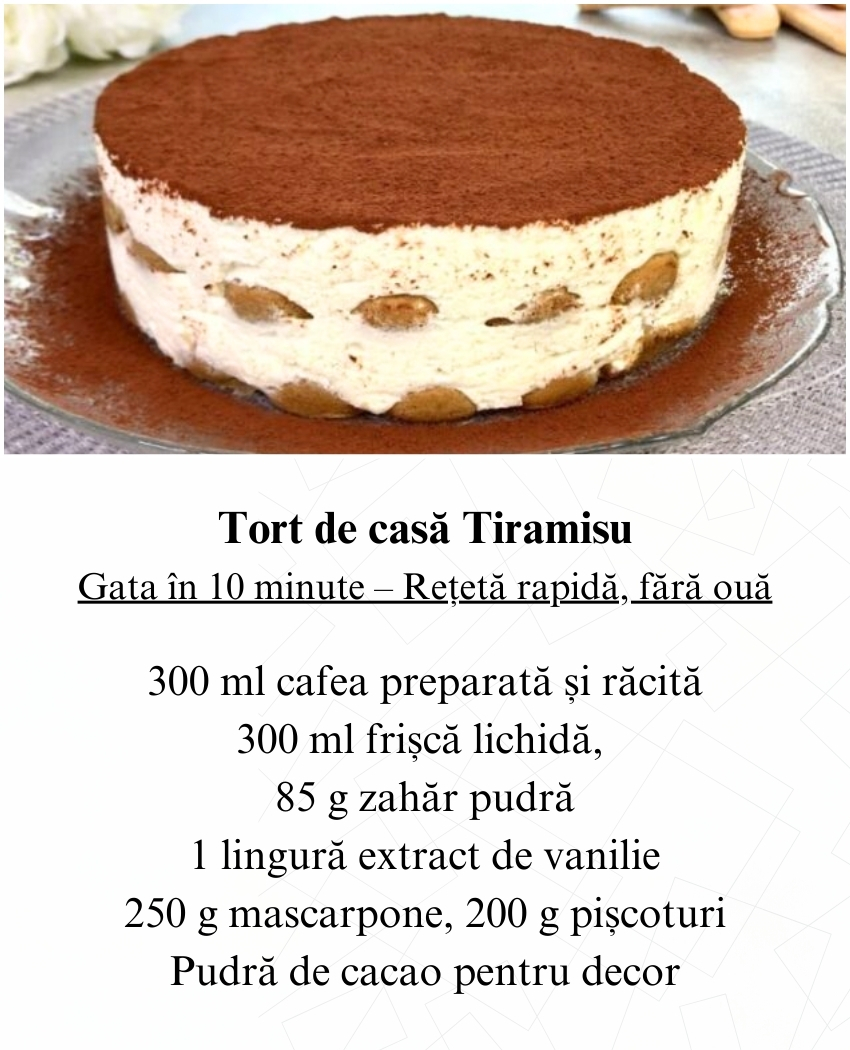 Dacă îți dorești un desert rapid, fără ouă și extrem de savuros, acest Tort Tiramisu este soluția perfectă. Se prepară în doar 10 minute, iar combinația de cafea, cremă fină de mascarpone și pudră de cacao îți va oferi o experiență dulce și răcoritoare.
