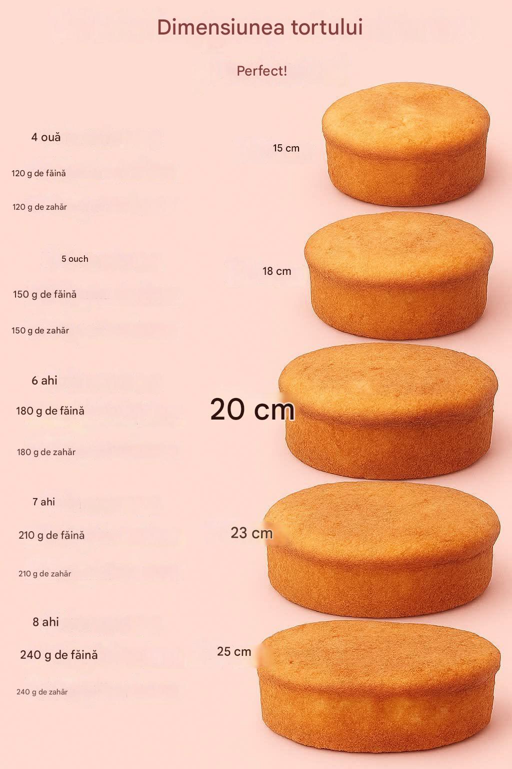 Coaceți în cuptorul preîncălzit la 170°C (340°F) timp de 35-40 de minute sau până când o scobitoare introdusă în centrul tortului iese curată. Prăjitură cu 5 ouă (tavă de copt de 18 cm)